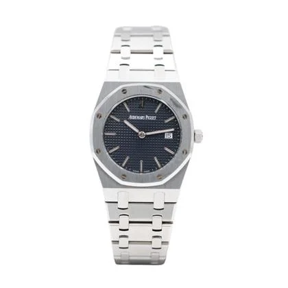 The Audemars Piguet Royal Oak 56175ST is an iconic luxury timepiece crafted in steel, featuring a blue dial with no numerals and a matching steel bracelet. Powered by the quartz Caliber 2612, this pre-owned watch is in very good condition, showing only minor signs of wear such as small, intangible scratches. It comes complete with its original box and papers.
