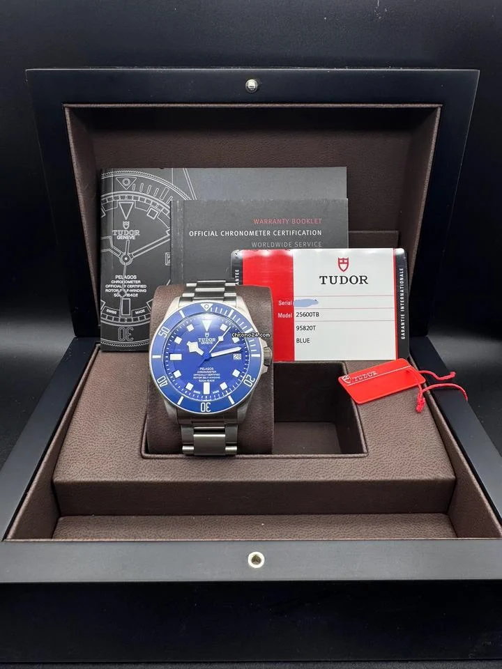 The Tudor Pelagos is a professional-grade dive watch known for its lightweight titanium construction and exceptional 50 ATM water resistance. This model features a blue dial, powered by the MT5612 automatic movement with a 70-hour power reserve, offering robust performance for daily wear and underwater adventures. The watch is in very good condition with only minor, almost invisible scratches.
